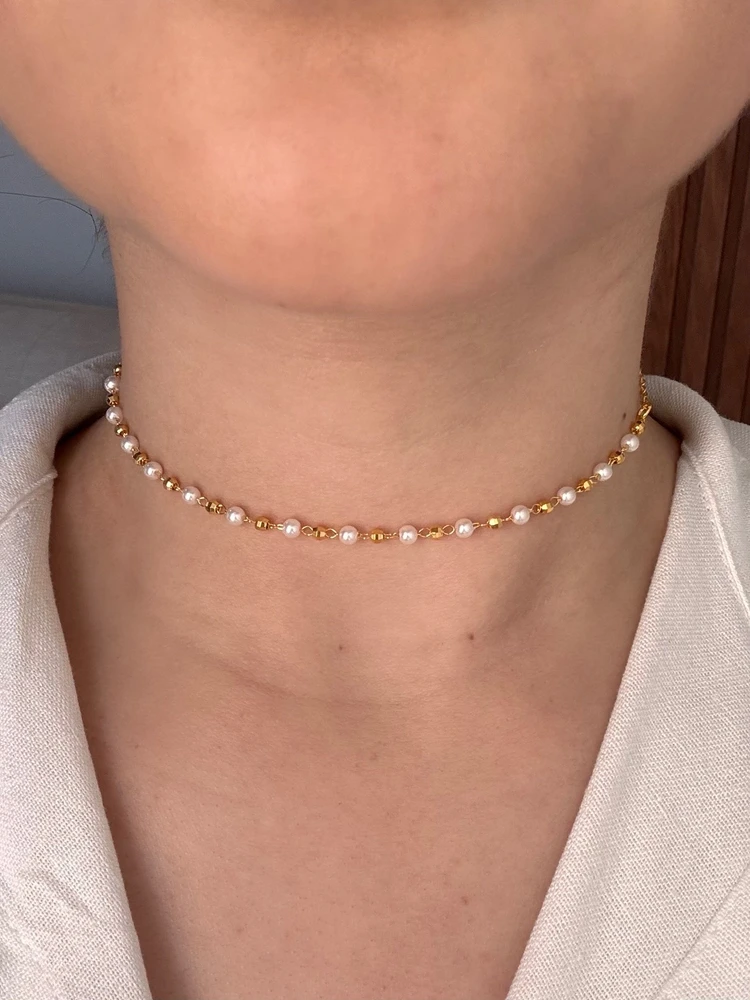 Colar Choker Folheado Com Bolinhas de Perolas Delicadas