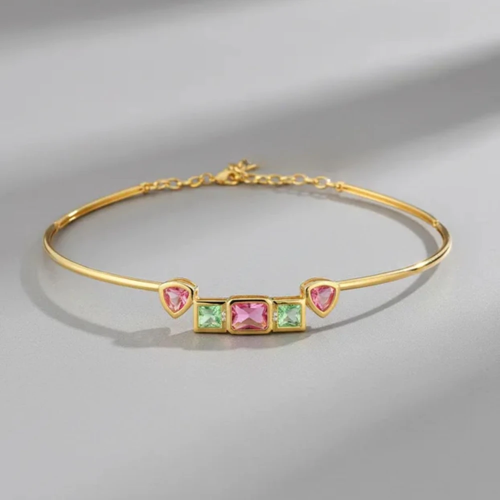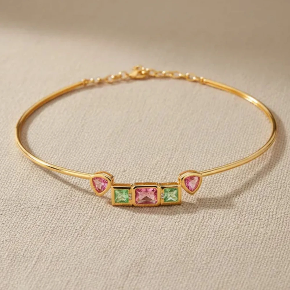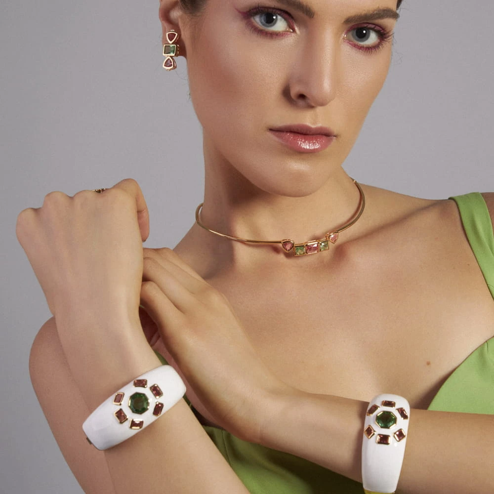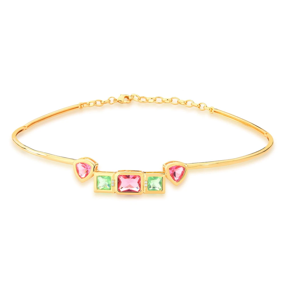 Gargantilha maleável com cristais diversos nos formatos triangulares, retangular e quadrados na parte da frente na cor rosa e verde e zircônias brancas banhado a ouro.