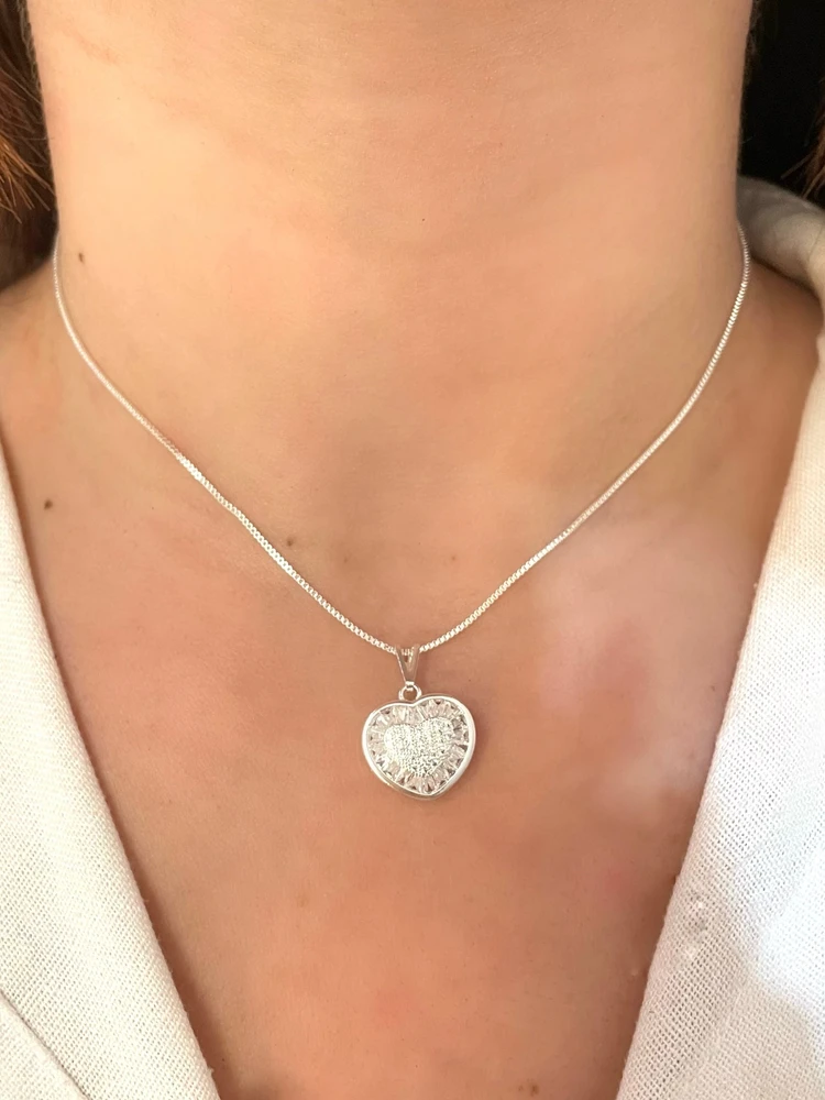 O Colar Coração Cravejado Folheado Prata traz um design sofisticado com pingente em formato de coração, cravejado com micro pedrinhas cintilantes que refletem a luz com elegância.