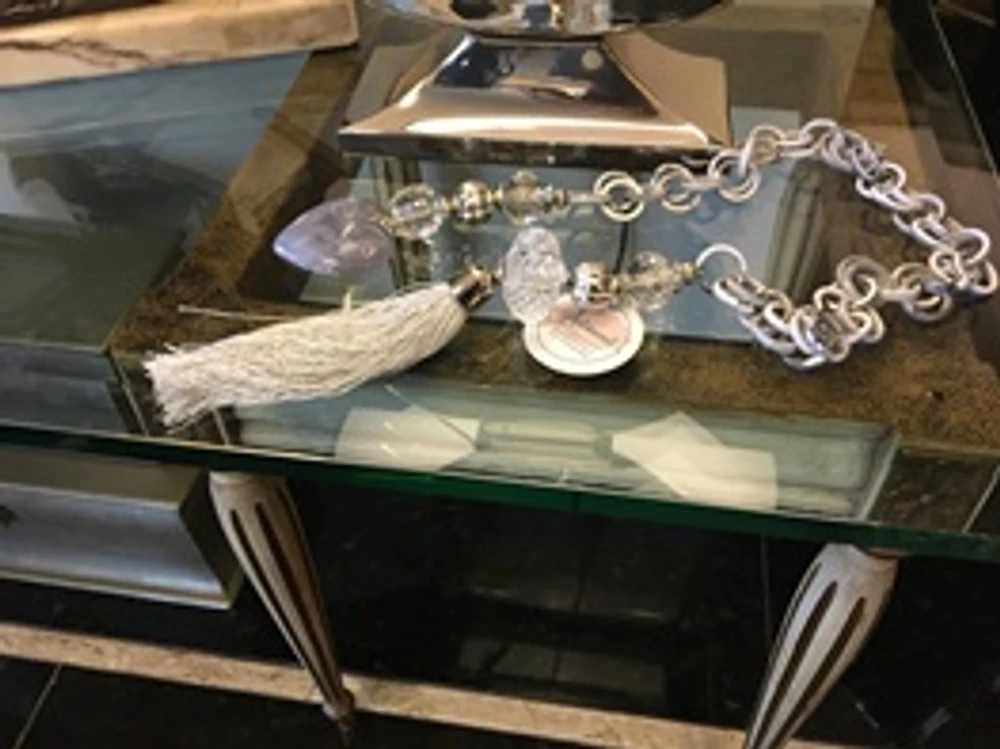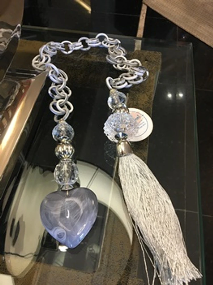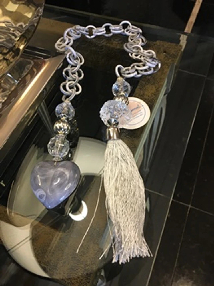 Colar de Mesa feito com argolas e coração em resina, acessórios, e tassel.