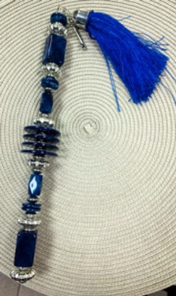 Colar de mesa feito com haste e resina marmorizada e tassel . Ambos na cor azul.