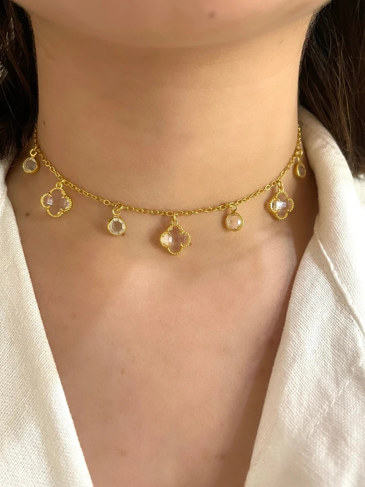 Com pingentes intercalados de trevos vazados e cristais transparentes, ele simboliza sorte, elegância e boas energias, tornando-se um toque especial em qualquer produção.