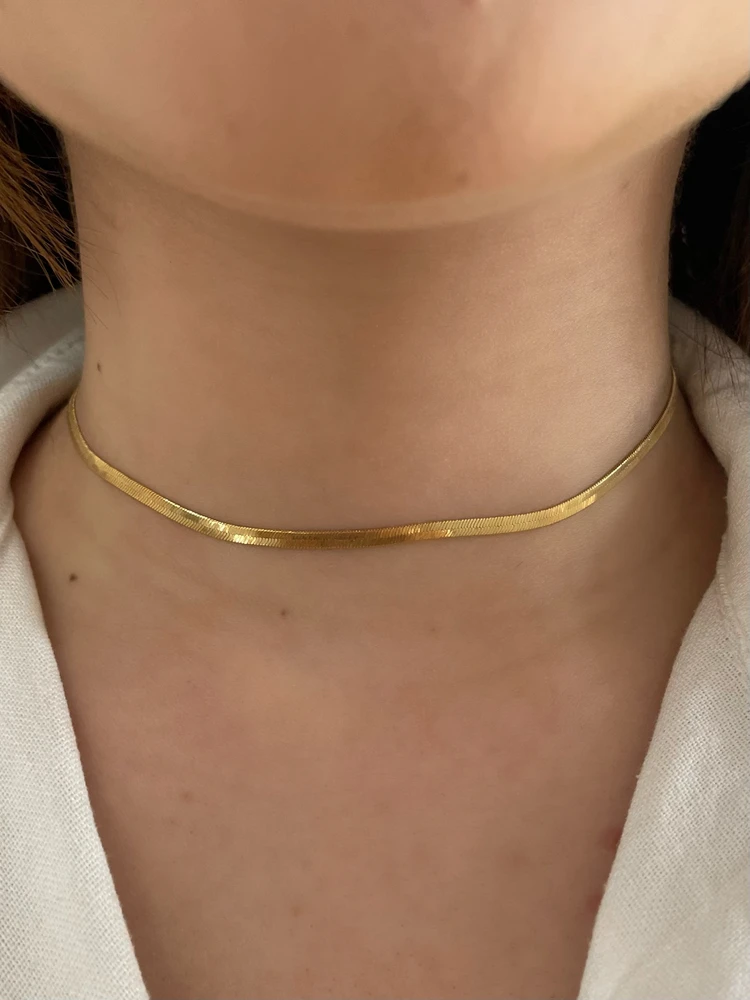 Seu formato achatado e delicado se ajusta perfeitamente ao colo, proporcionando um visual moderno e refinado. Ideal para ser usado sozinho ou em composição com outros colares para criar o famoso mix dourado da moda. ✨