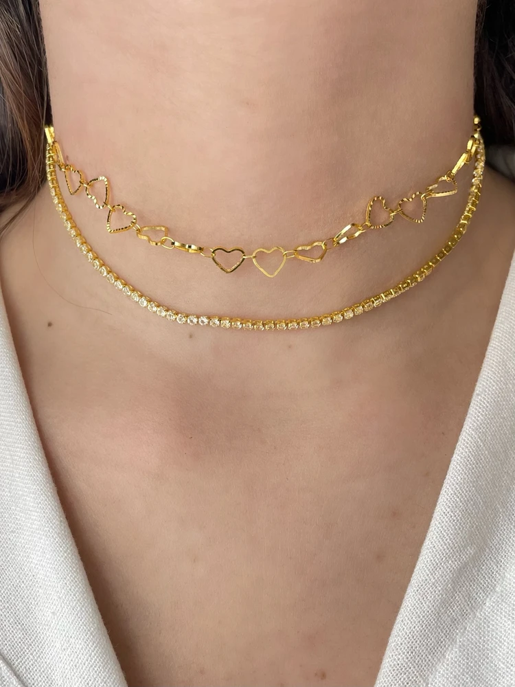 Composto por duas camadas de correntes finas — uma lisa e outra com corações vazados —, ele traz o equilíbrio perfeito entre o moderno e o romântico.