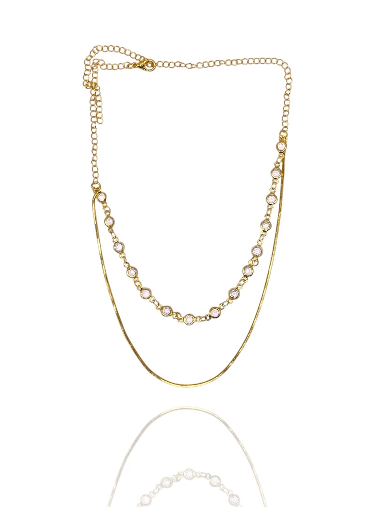 O Colar Duplo Fita com Pedrinhas é o acessório perfeito para complementar seu look com estilo e elegância. Composto por duas delicadas fitas entrelaçadas e pedrinhas brilhantes, este colar é perfeito para dar um toque de sofisticação a qualquer visual.