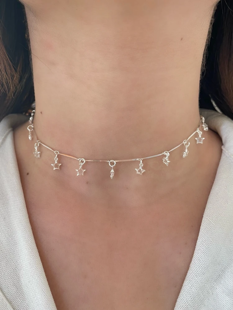 Com pequenas estrelas penduradas ao longo da corrente e estrutura folheada em prata de alto brilho, ele traz um toque romântico e celestial ao visual 🌙💫