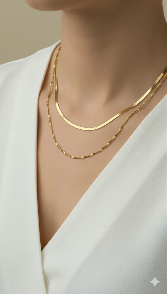 A composição conta com duas correntes distintas: uma corrente lisa de acabamento polido, que traz leveza e brilho sutil, e uma corrente torcida, que adiciona textura e personalidade ao conjunto. Essa combinação garante versatilidade, permitindo que o colar transite facilmente entre produções do dia a dia e looks mais elaborados.