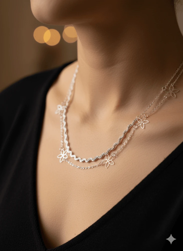 A corrente torcida traz textura e movimento à peça, enquanto os pingentes florais distribuídos ao longo do colar acrescentam um toque romântico e refinado. O acabamento delicado permite combinações versáteis, tornando o colar ideal tanto para o dia a dia quanto para produções mais elaboradas.