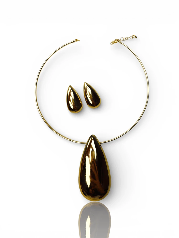 O destaque do colar é o pingente em formato de gota com acabamento espelhado, que adiciona personalidade e movimento à peça. O contraste entre a estrutura rígida do choker e o design orgânico do pingente cria um equilíbrio visual elegante e atual, tornando o acessório um verdadeiro ponto focal no look.