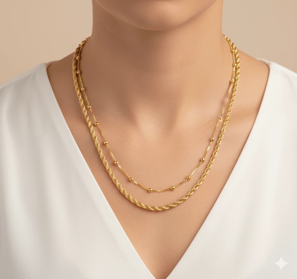 O Colar Feminino Elisa de Correntes Duplas Folheadas com Detalhes Delicados é uma peça elegante e atemporal, ideal para quem busca sofisticação com leveza no visual. Seu design em camadas traz duas correntes harmoniosamente combinadas, criando um efeito moderno e refinado que valoriza o colo com sutileza.