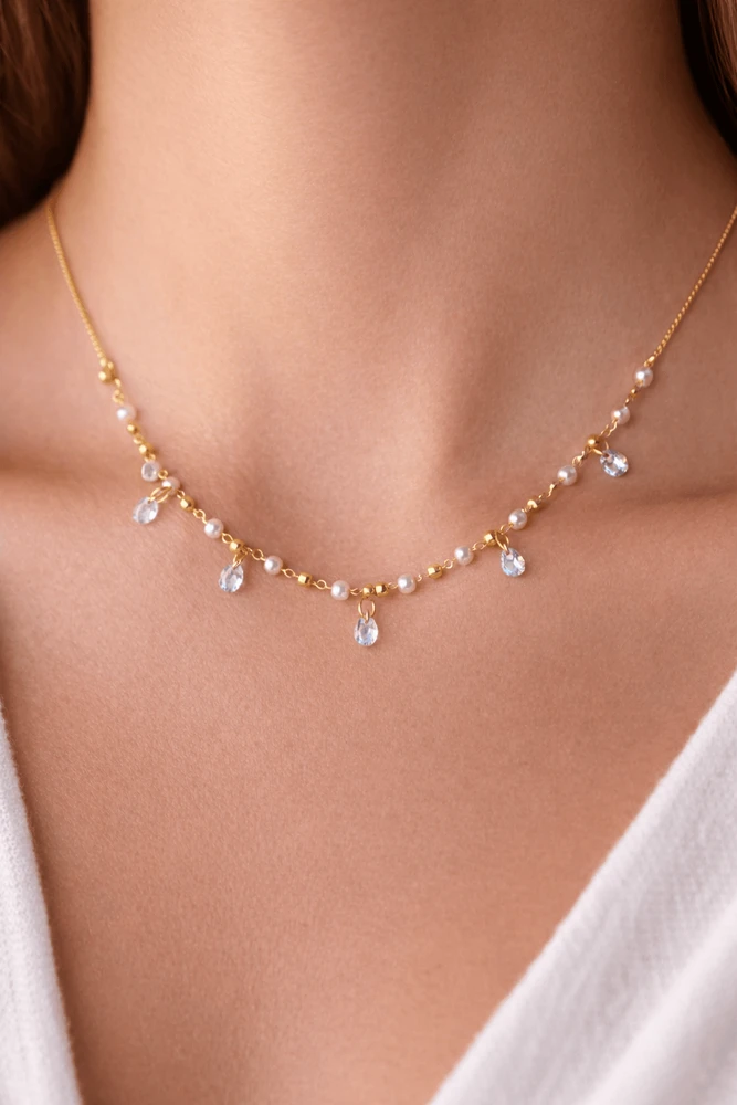 A corrente é composta por elos finos intercalados com pérolas, proporcionando um acabamento refinado e atemporal. Os cristais pendentes adicionam movimento e luminosidade à peça, valorizando o colo de forma sutil e elegante. É um colar versátil, perfeito para compor desde looks casuais até produções mais elaboradas.