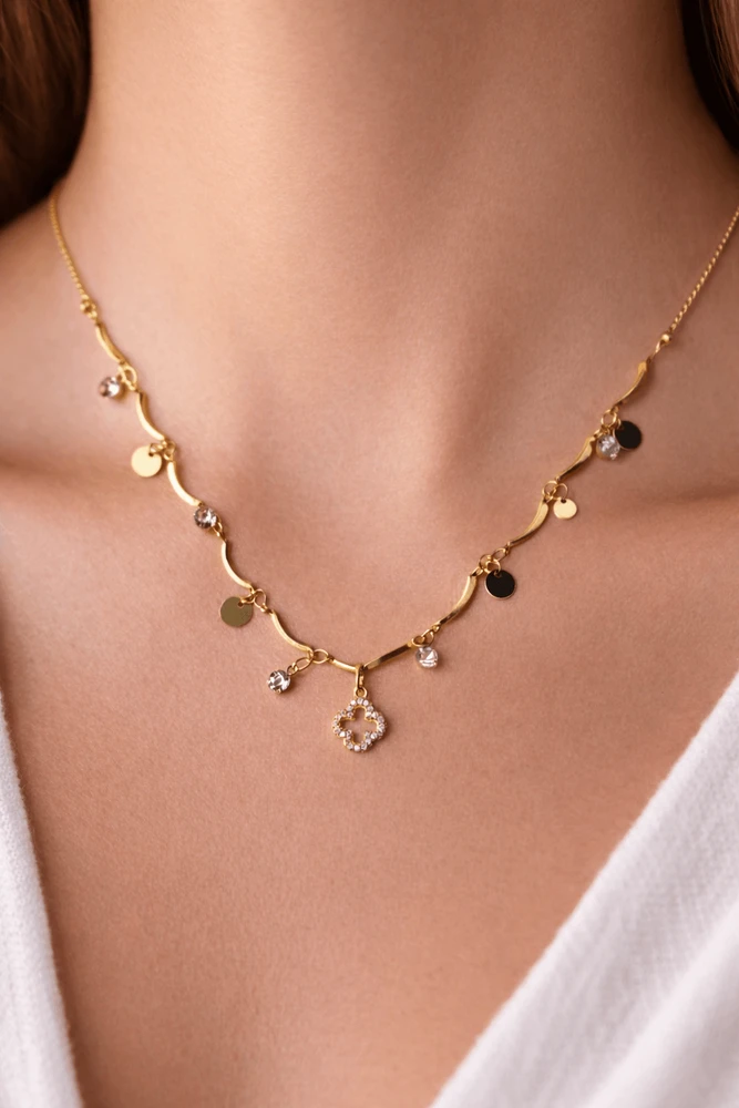 Os pequenos pingentes adicionam um toque contemporâneo e feminino à peça, tornando o colar perfeito para compor desde produções básicas do dia a dia até looks mais elaborados para ocasiões especiais. O acabamento folheado garante brilho sutil e um visual elegante, valorizando qualquer composição.