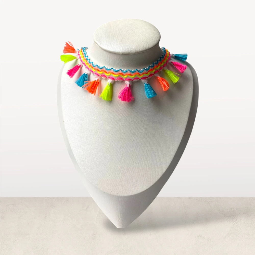 Seu trançado é feito com fios têxteis resistentes e delicados, formando uma base firme e confortável para o uso prolongado. Ao longo do colar, pequenos pingentes em formato de tassel adicionam movimento, leveza e um toque fashion irresistível. O acabamento com fecho metálico garante segurança, praticidade e durabilidade.