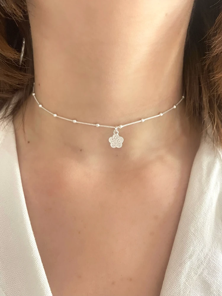 Com uma corrente fina intercalada por pequenas esferas prateadas e um pingente em formato de flor totalmente cravejado com micro zircônias, ele traz brilho suave e elegante para qualquer ocasião.