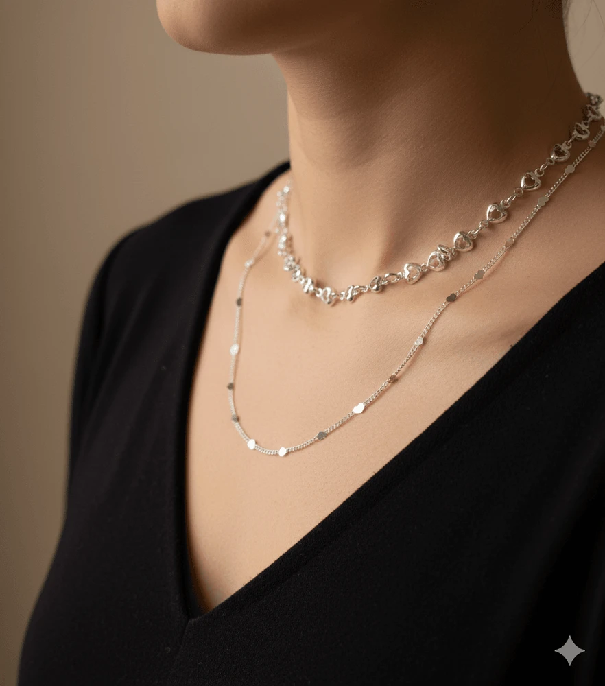O Colar Gabriela é uma peça moderna e cheia de personalidade, desenvolvida em design duplo que une delicadeza e estilo contemporâneo. A composição traz duas correntes distintas: uma com elos em formato de coração, que adicionam um toque feminino e elegante, e outra com pequenos detalhes contrastantes distribuídos ao longo da corrente, criando um visual sofisticado e atual.