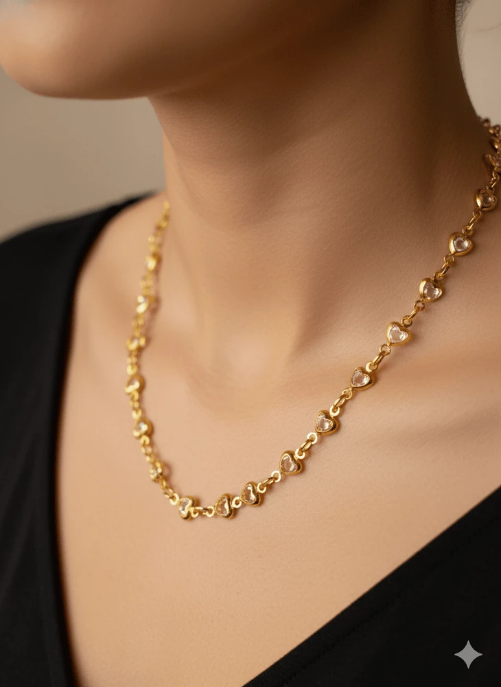 O Colar Maitê é uma peça delicada e feminina, ideal para quem busca um acessório romântico com acabamento sofisticado. Desenvolvido com elos em formato de coração vazados ao longo da corrente, ele cria um visual leve, elegante e cheio de charme.