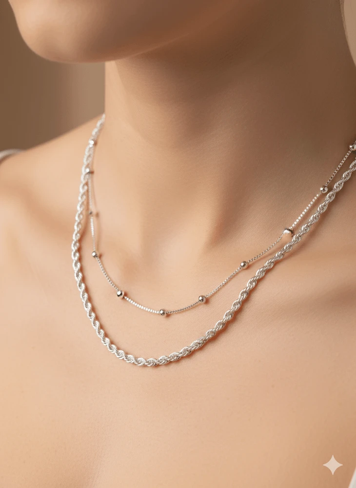 O efeito em camadas valoriza o colo de forma equilibrada, trazendo profundidade ao visual sem perder a leveza. A mistura das texturas proporciona um acabamento refinado, tornando o colar ideal tanto para produções minimalistas quanto para looks mais elaborados.