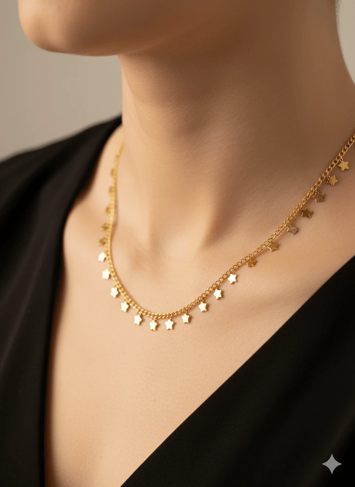 As estrelas adicionam movimento e um toque lúdico à peça, valorizando o colo de forma sutil e elegante. O design delicado permite fácil combinação com diferentes estilos, sendo ideal tanto para o uso diário quanto para composições mais sofisticadas em sobreposição com outros colares.