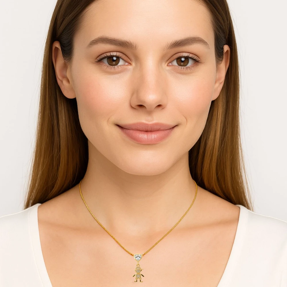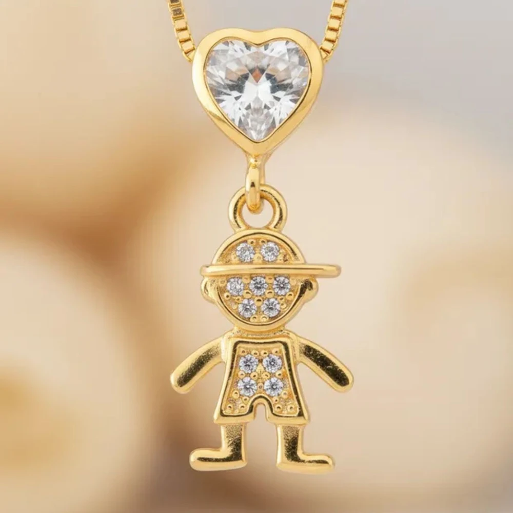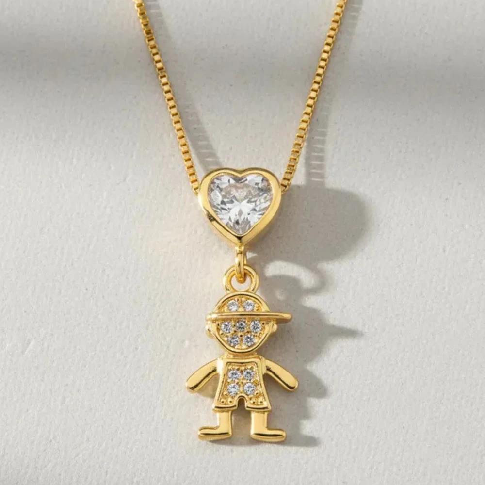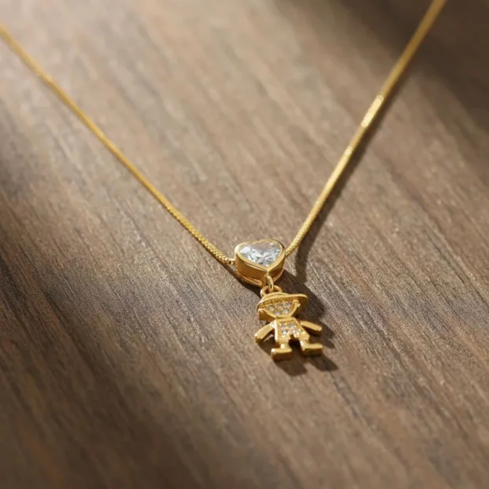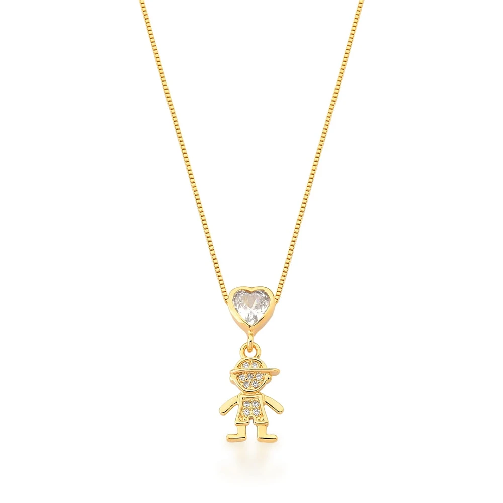 Corrente em malha veneziana e pingente de menino com coração cravejado de zircônias brancas com pingente banhado a ouro.