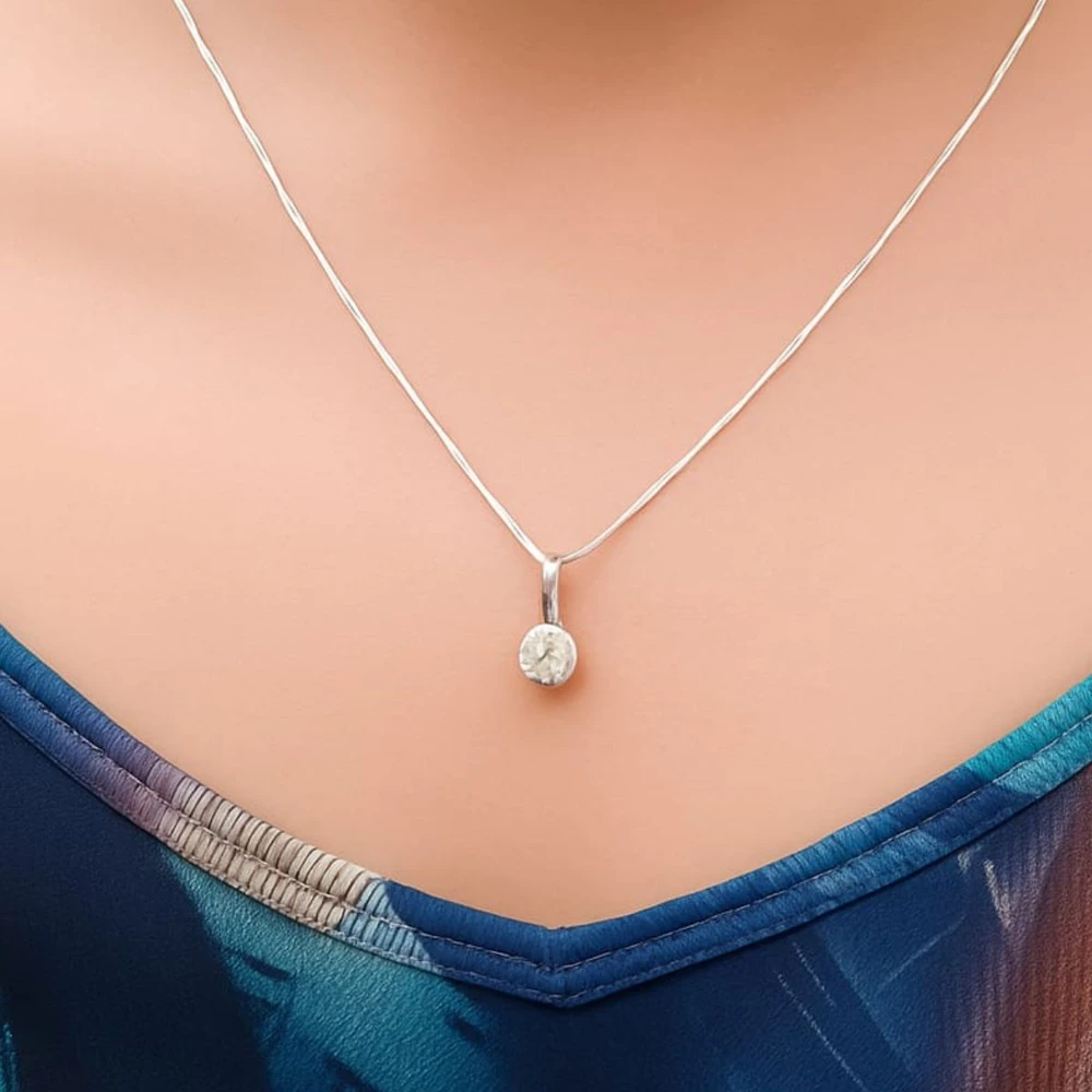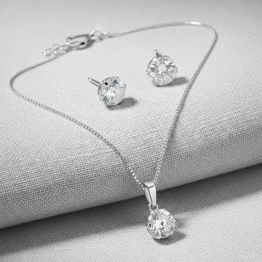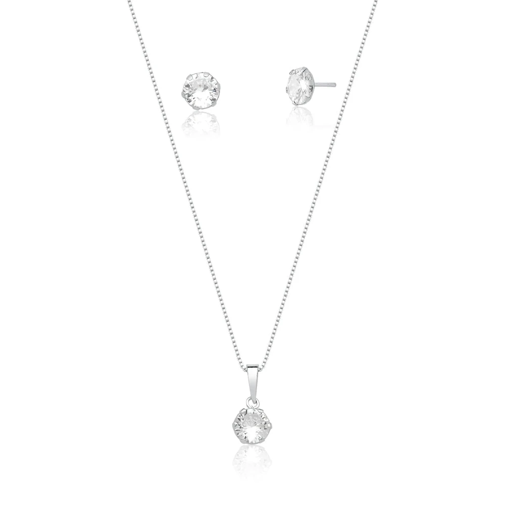 Conjunto brinco e corrente em malha veneziana com pingente ponto de luz zircônia redonda branca.