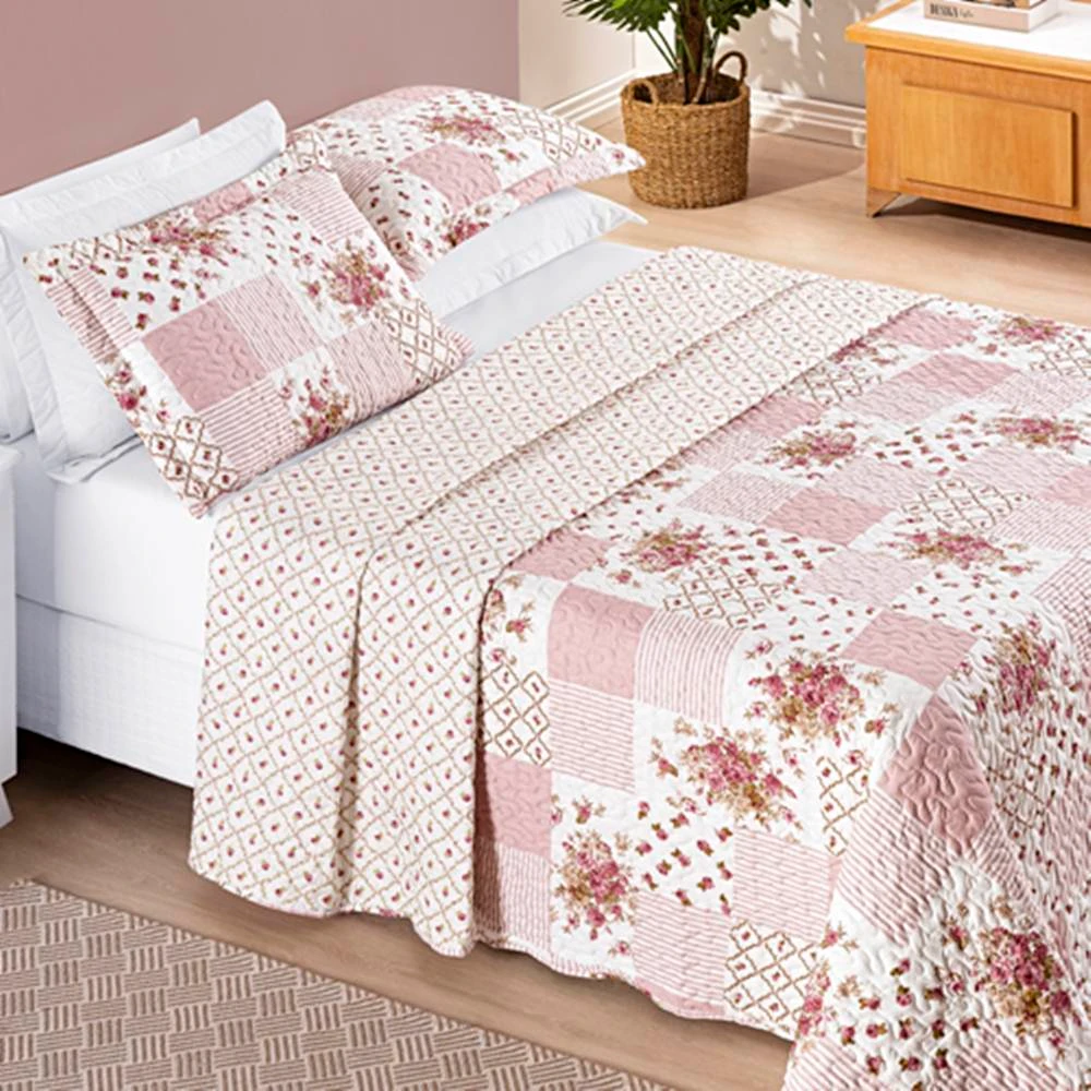 Colcha Casal Padrão Bouti Estampada Dupla Face 3 Peças - Rosa Matura