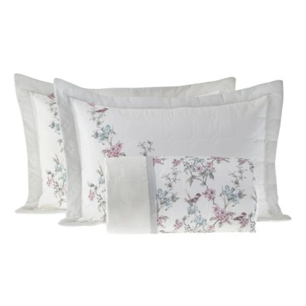 Modo de uso: Ajustar a colcha sobre a cama e posicionar os porta-travesseiros correspondentes.