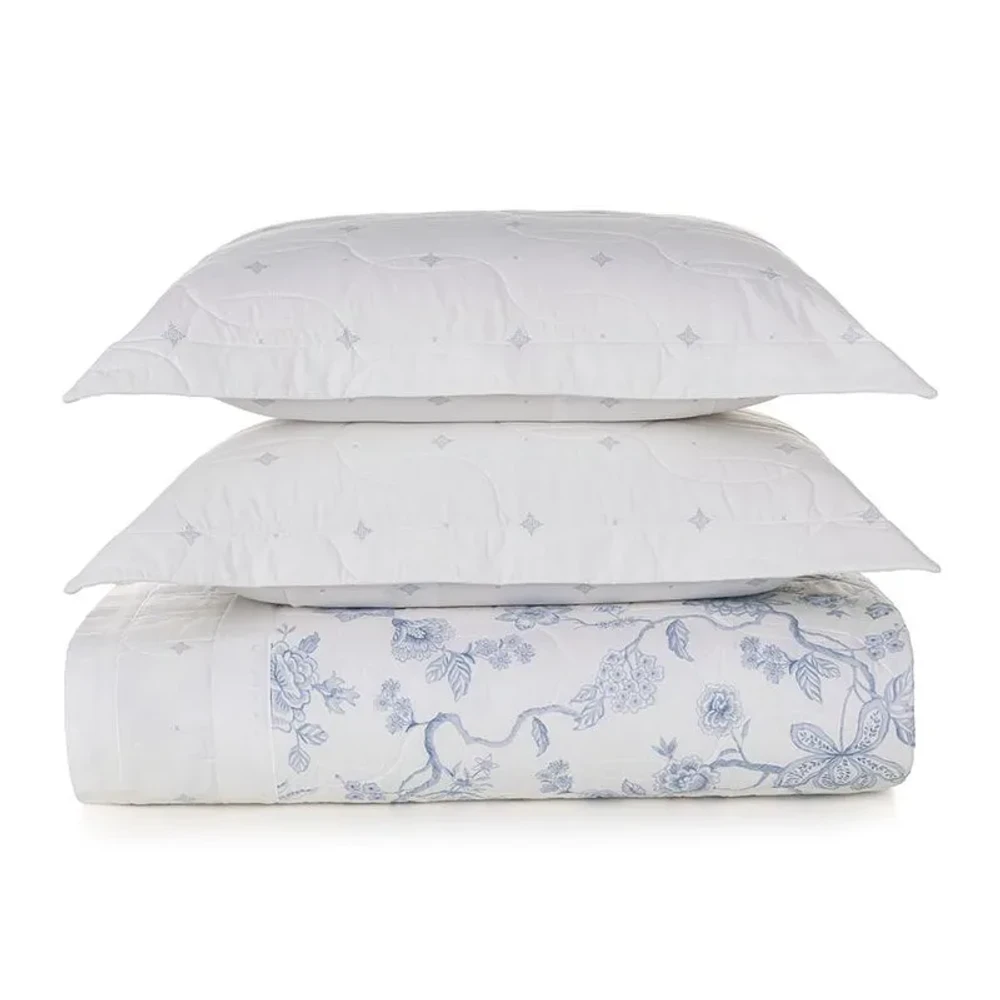 A colcha Dora king 200 fios azul Karsten oferece conforto e sofisticação para transformar o quarto em um ambiente acolhedor. Confeccionada em 100% algodão percal, proporciona toque macio, volume encorpado e alta respirabilidade, sendo hipoalergênica e resistente a bolinhas. O modelo dupla face, com acabamento nos quatro lados e cantos quadrados, garante praticidade e elegância. Os porta-travesseiros, com estampa delicada e 3 abas de 7cm, completam a composição com charme.
