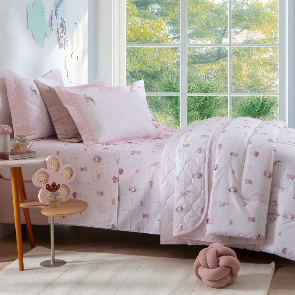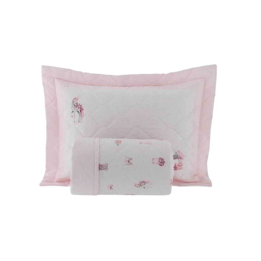 Modo de uso: Ajustar a colcha sobre a cama e posicionar o porta-travesseiro correspondente.