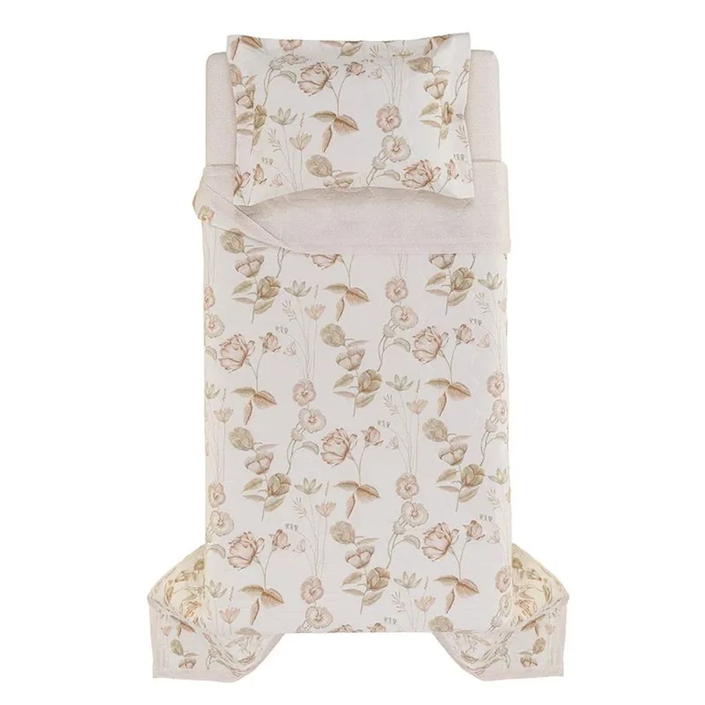 A colcha Mariê solteiro 200 fios bege Karsten combina conforto, sofisticação e praticidade para o quarto. Confeccionada em 100% algodão percal, é macia, encorpada, hipoalergênica, altamente respirável e resistente a bolinhas. O modelo dupla face, com cantos quadrados, permite variar o estilo da cama, enquanto o porta-travesseiro 50cm x 70cm com 3 abas de 5cm adiciona um toque elegante. A estampa floral em fundo branco harmoniza facilmente com diferentes decorações.