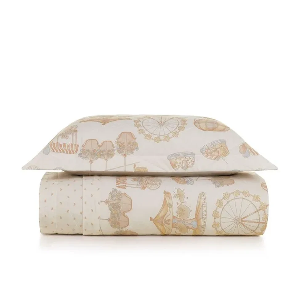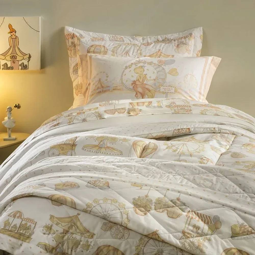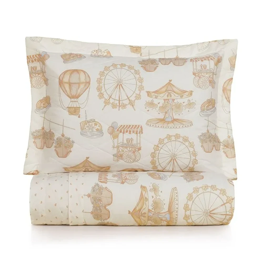 A Colcha Infantil Vick une conforto e charme para o quarto das crianças. Confeccionada em 100% algodão 200 fios, é macia, respirável, hipoalergênica e resistente a bolinhas, garantindo aconchego e durabilidade. A dupla face com cantos quadrados permite versatilidade no visual, enquanto o porta-travesseiro adiciona um acabamento delicado. Com fundo bege e estampas lúdicas de brinquedos, transforma o ambiente em um espaço acolhedor e divertido, podendo ser combinada com o jogo de cama e edredom da mesma linha.