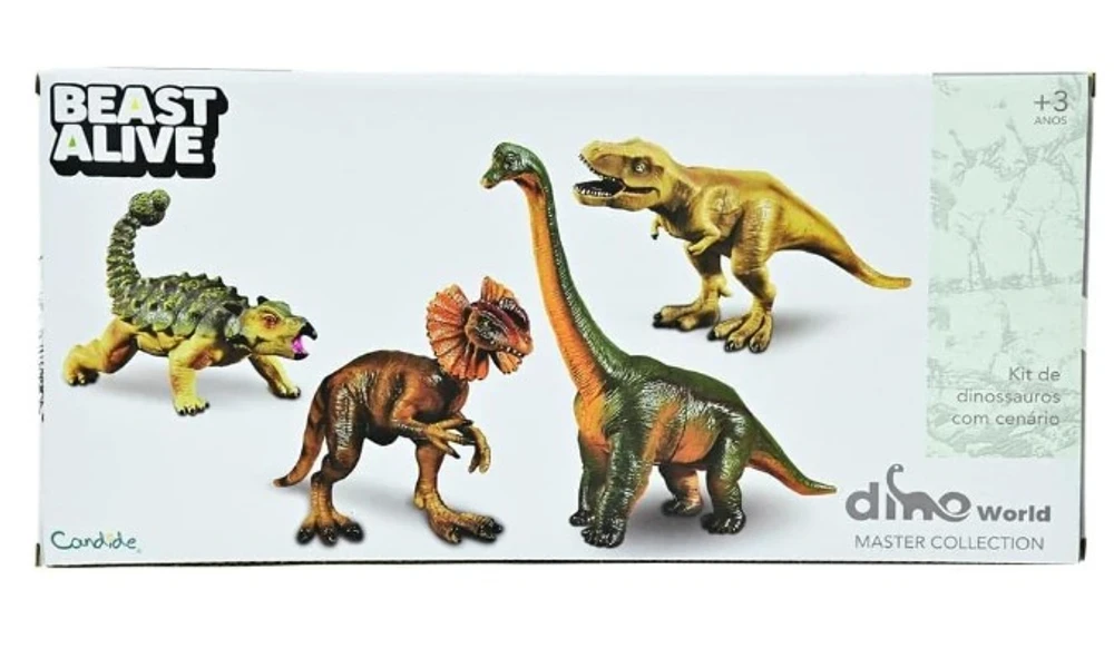 Kit Com 4 Dinossauros e cenário Dino World Beast Alive Candide
