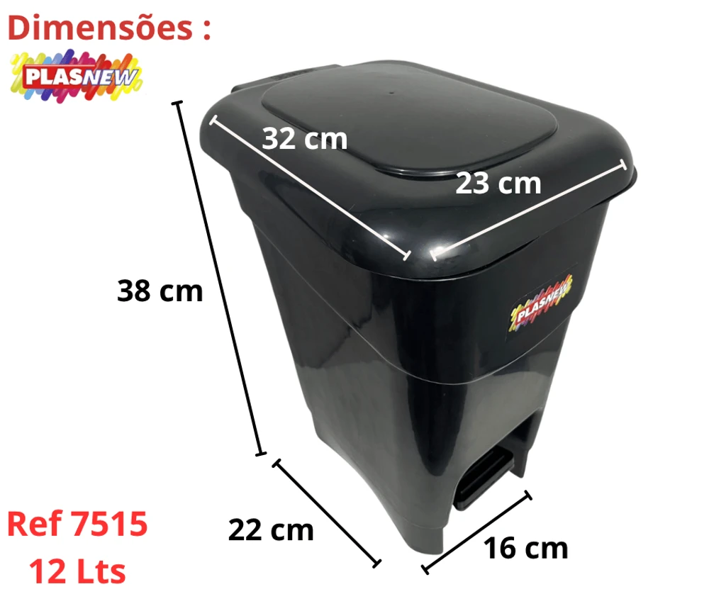 Coletor Cesto Lixeira De Pedal 12 Lt Plasnew Preto