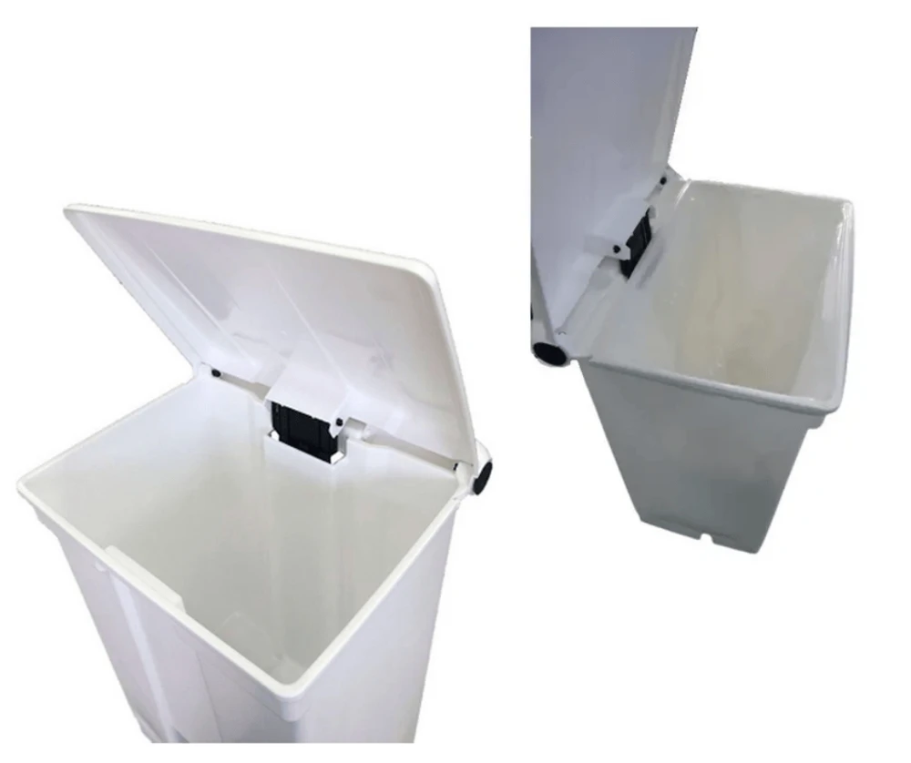 Sua tampa com sistema de abertura e fechamento através de pedal promove a vedação do coletor evitando a dispersão de odores e a entrada de insetos, além de evitar os riscos de contaminação.