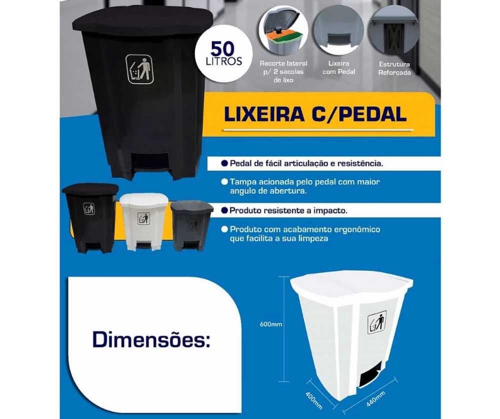 - Acionamento por Pedal: O pedal de fácil acionamento permite descartar o lixo sem tocar na lixeira, evitando o contato direto e promovendo mais higiene.