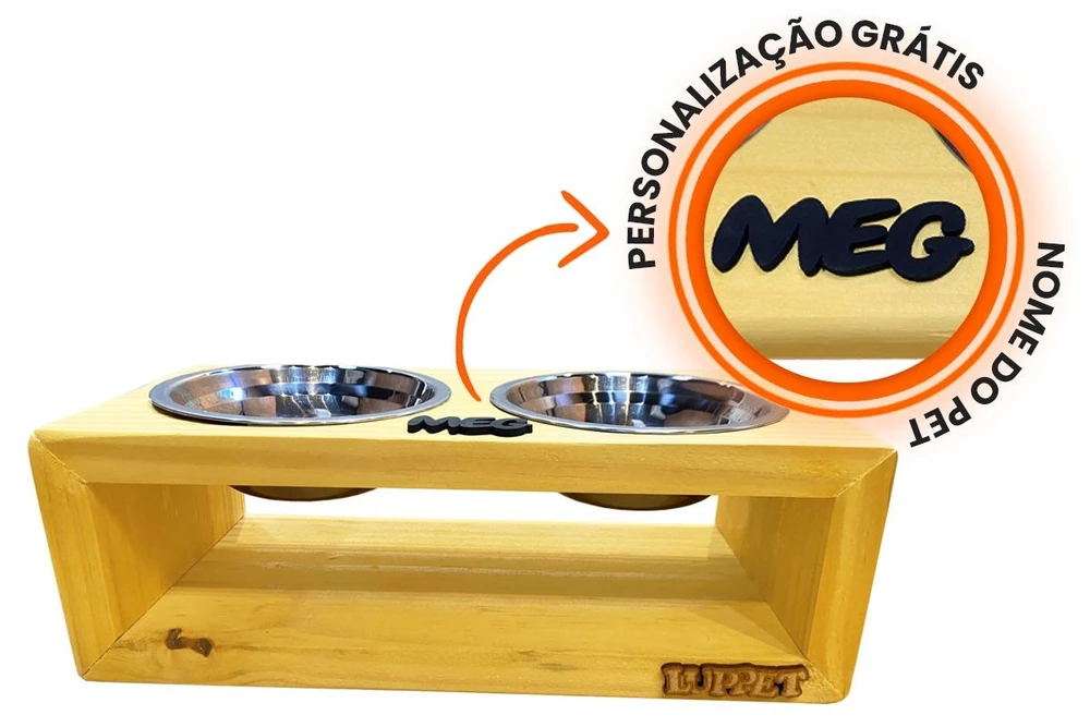 O Comedouro e Bebedouro são fabricados com verniz para proteger da água e os efeitos dos líquidos que podem eventualmente ser derramados sobre ele. Além disso, possui dois buracos feitos especialmente para acomodar os potinhos de Inox que o acompanham, podendo ser retirados para limpeza.