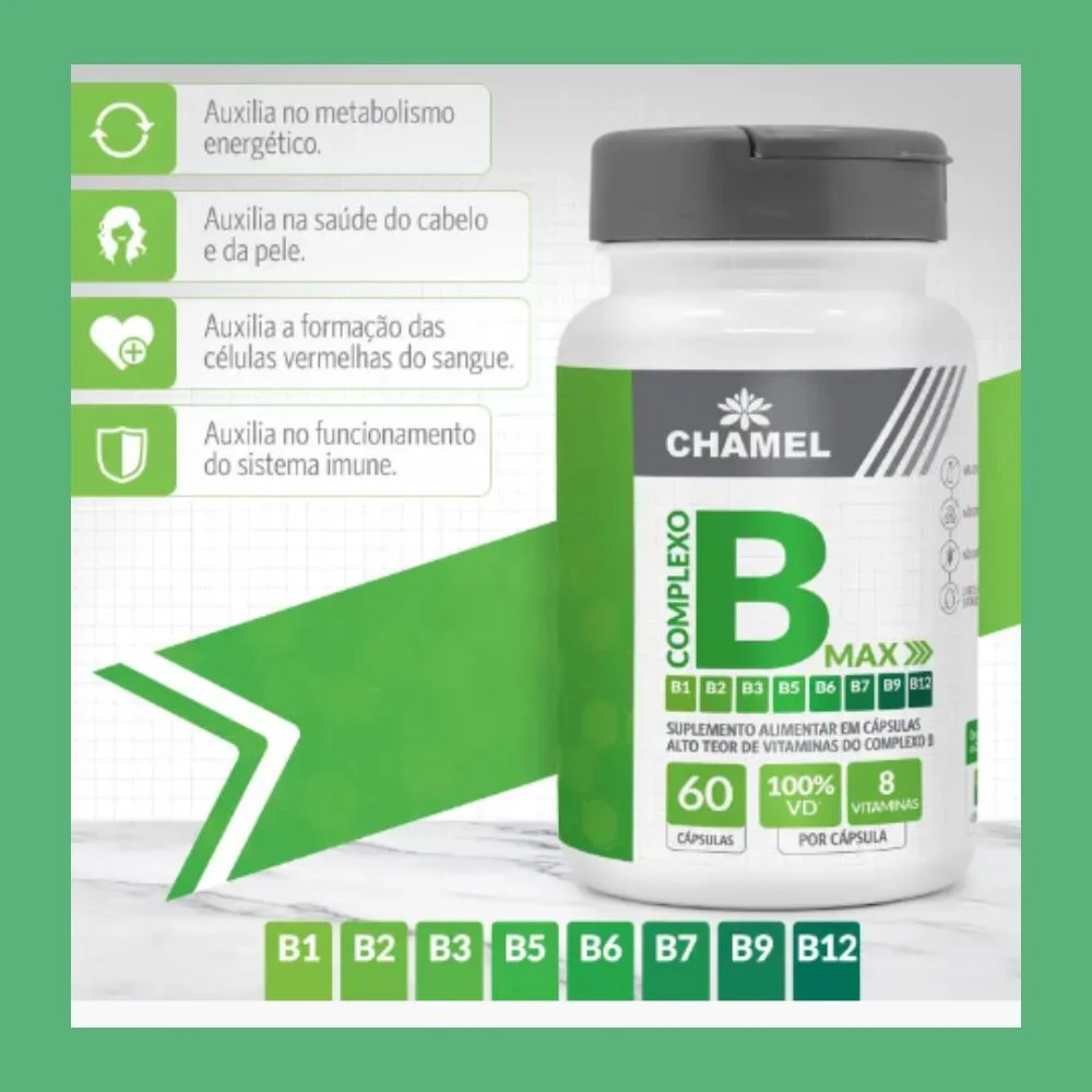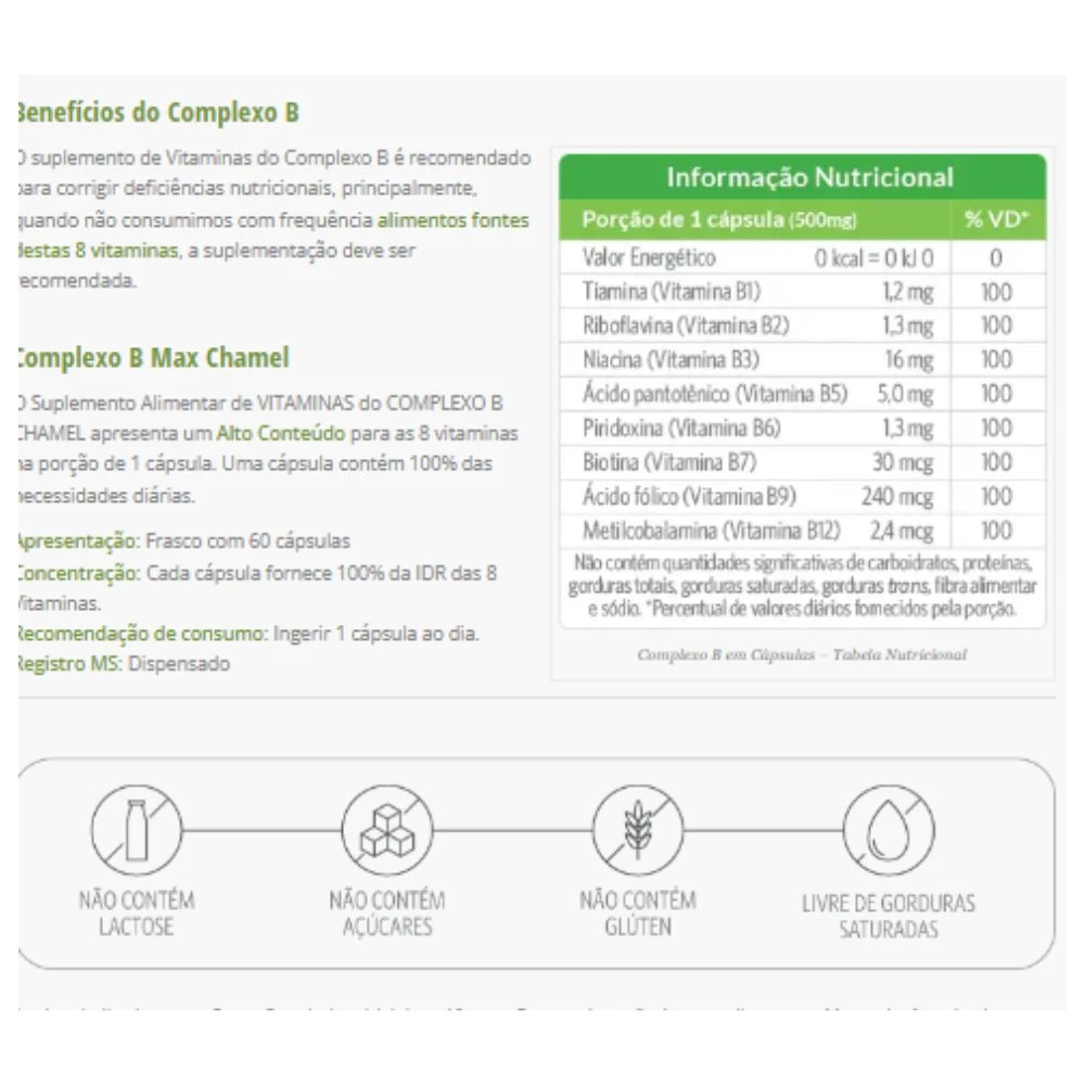 O Suplemento Alimentar de VITAMINAS do COMPLEXO B CHAMEL apresenta um Alto Conteúdo para as 8 vitaminas na porção de 1 cápsula. Uma cápsula contém 100% das necessidades diárias.