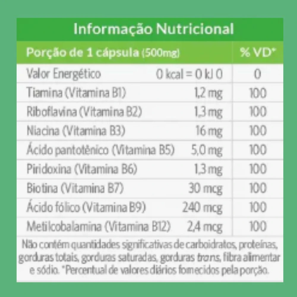 O complexo B é uma associação de 8 vitaminas importantes para o corpo humano, conhecidas como, Tiamina (B1), Riboflavina (B2), Niacina (B3), Ácido pantotênico (B5), Piridoxina (B6), Biotina (B7), Ácido fólico (B9) e cobalamina (B12).