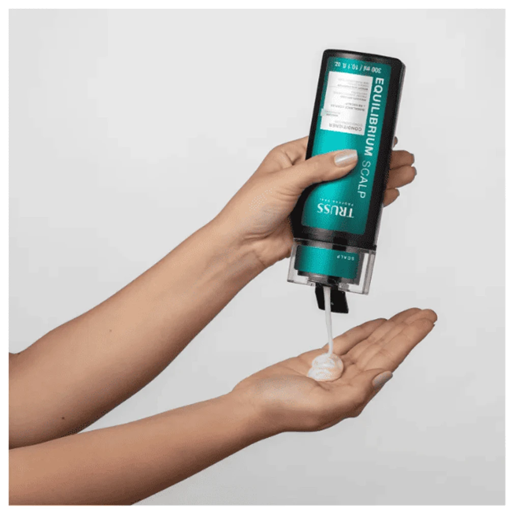 Após lavar o cabelo com o Shampoo Truss Equilibrium Scalp, aplique o condicionador do comprimento às pontas. Deixe agir por alguns minutos e enxágue completamente.