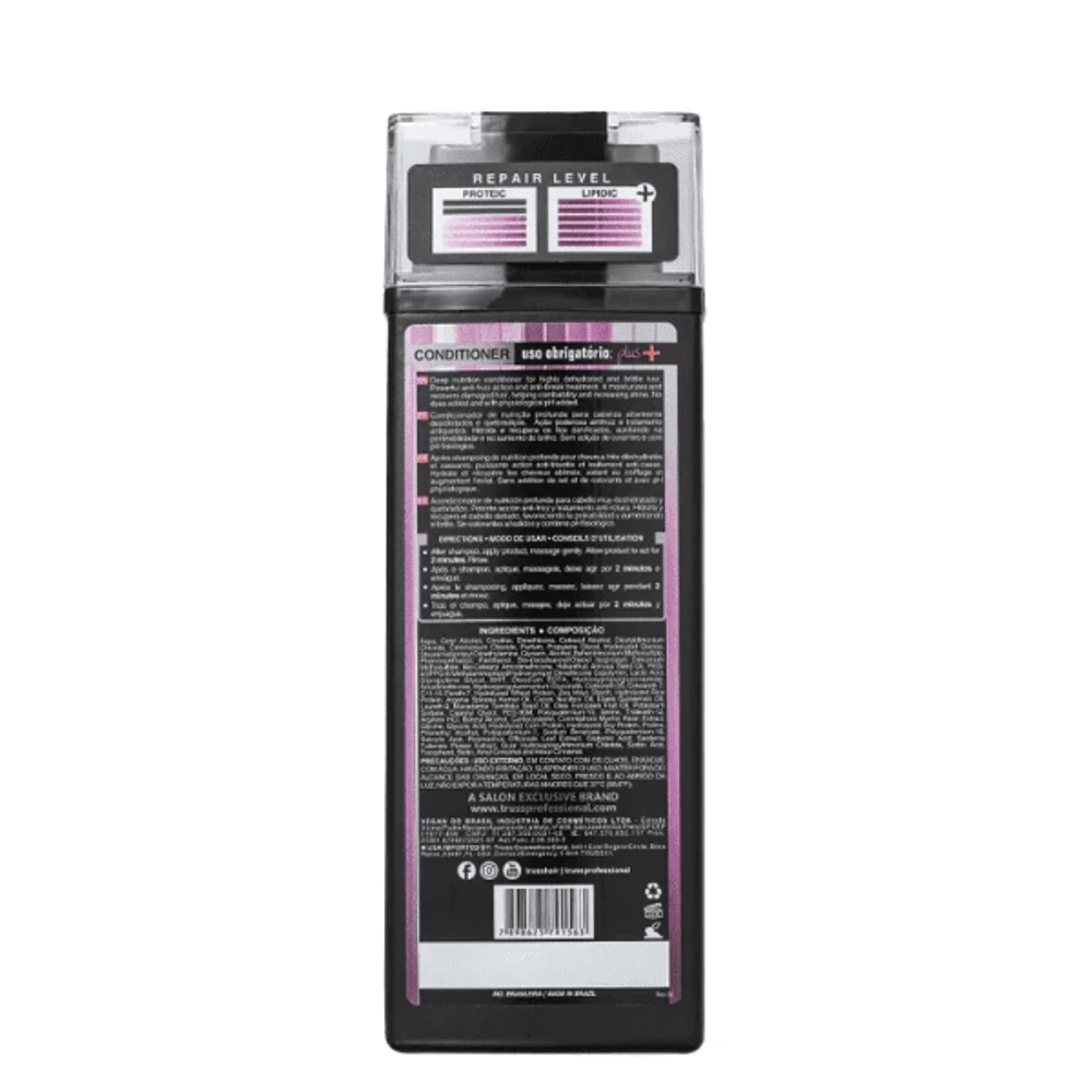 O Condicionador Truss Uso Obrigatório Plus foi desenvolvido para oferecer um cuidado profundo e reparador para os seus fios, proporcionando hidratação intensa, brilho radiante e maciez duradoura. Sua fórmula rica e nutritiva é ideal para cabelos danificados, opacos ou ressecados, trazendo um toque de saúde e vitalidade para cada fio.