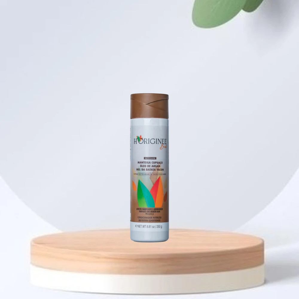 NUTRISHINE Condicionador Vegano e Orgânico para cabelos danificados e quebradiços. Com manteiga de cupuaçu, óleo de argan e mel de batata yacon, promove nutrição intensa e reparação. Reduz frizz e quebra, devolvendo maciez e brilho saudável. pH balanceado (3,0-3,5) que fortalece a fibra capilar. Livre de sulfatos, silicones e conservantes, com 96% de ingredientes naturais. Reduz danos em 14% na 1ª aplicação. Aplicar no comprimento e pontas, agir por 3 min e enxaguar. Cuidado ético e profissional.