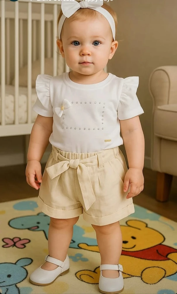Conjunto infantil com shorts bege claro e blusa branca de manga bufante, perfeito para deixar sua pequena elegante e confortável em qualquer ocasião. O short possui cinto de laço que valoriza a cintura e proporciona ajuste ideal, enquanto a blusa traz delicados detalhes em pedrinhas ao redor de um laço aplicado, conferindo um charme extra. Ideal para festas, passeios ou momentos especiais, o conjunto alia estilo e praticidade, com tecido leve e macio que respeita a pele sensível dos bebês. Complemente o visual com o acessório de laço para cabeça, que harmoniza com o look e agrega ainda mais fofura. Aposte em um outfit versátil e exclusivo para sua criança, combinando conforto, design sofisticado e acabamento premium.