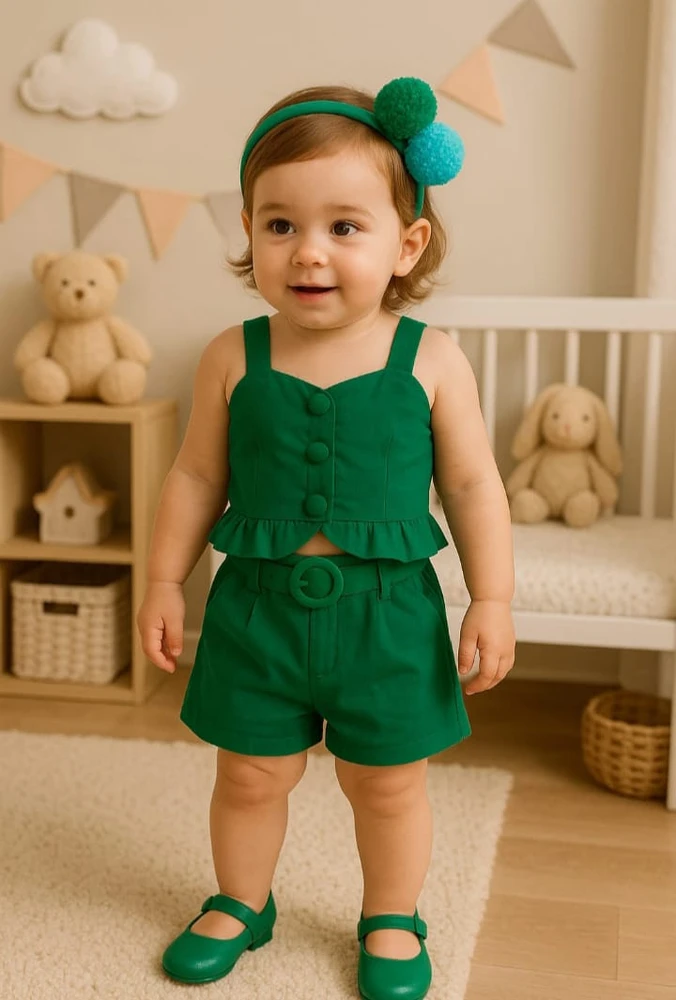 Conjunto infantil verde escuro, perfeito para ocasiões especiais e o dia a dia com estilo e conforto. O top regata apresenta botões forrados que acrescentam charme e delicadeza, além de um babado sutil na barra que valoriza o design exclusivo. O short no mesmo tom traz cinto forrado com fivela redonda, garantindo ajuste perfeito e acabamento sofisticado. Confeccionado em tecido macio e resistente, o conjunto alia praticidade e elegância para a rotina da sua pequena.