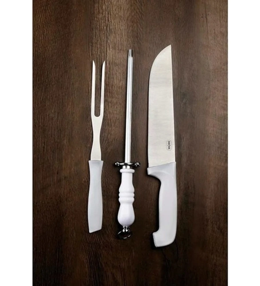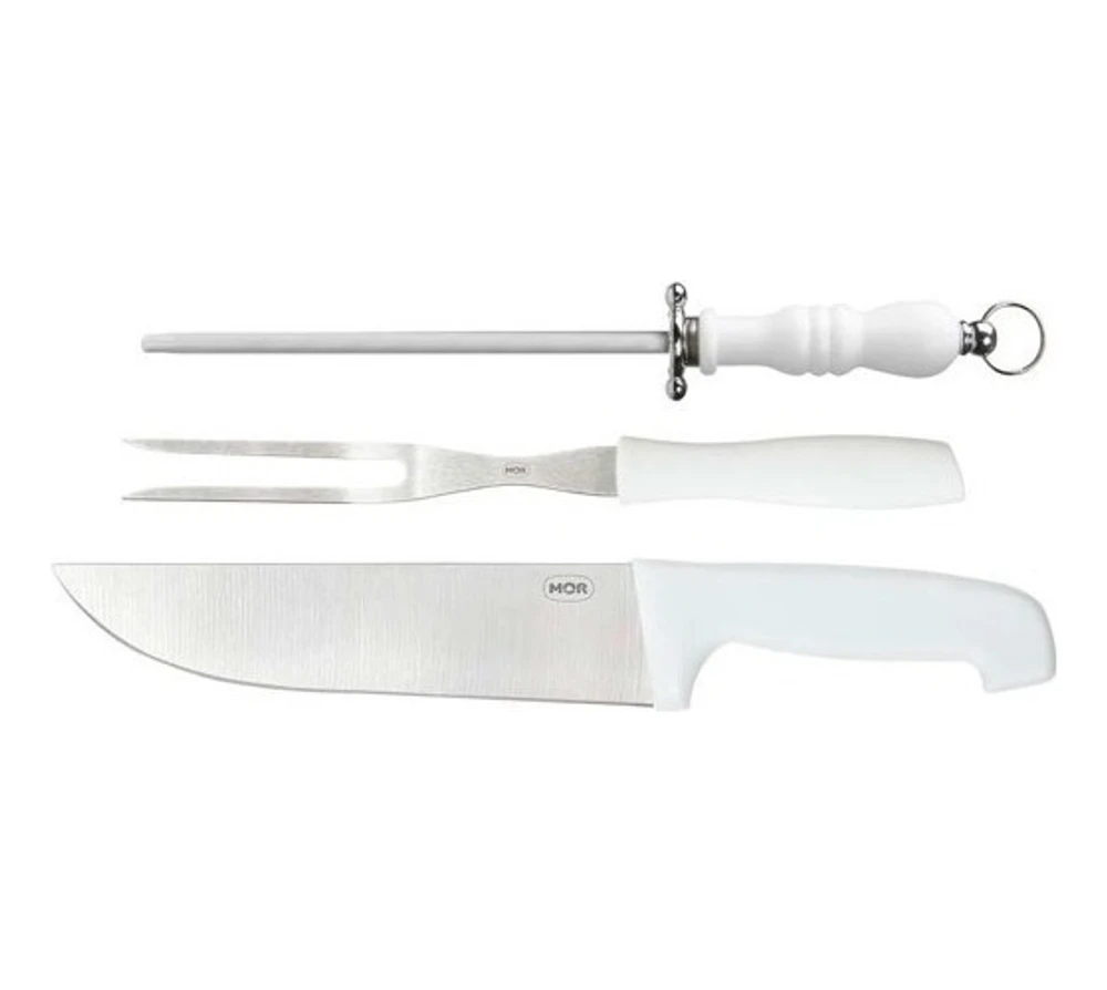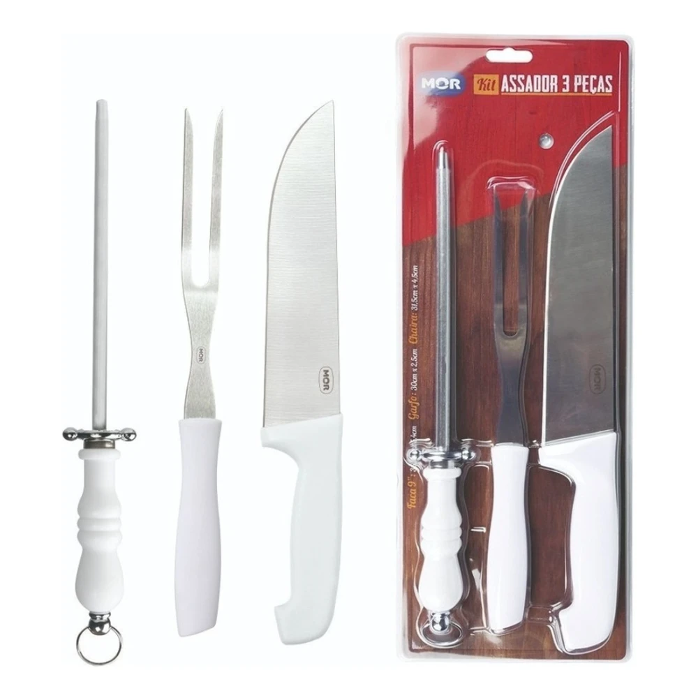 Ele acompanha uma faca, um garfo e uma chaira produzidos em aço inoxidável, que confere durabilidade e resistência às lâminas, e cabos brancos em polipropileno que facilitam a higiene e dão firmeza durante o manuseio. Indispensável para a hora de servir um delicioso churrasco, esse kit é perfeito para os churrasqueiros mais requintados até os assadores de fim de semana!