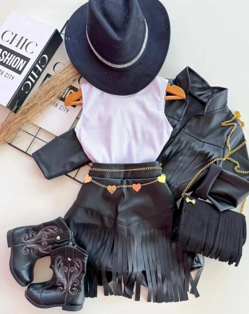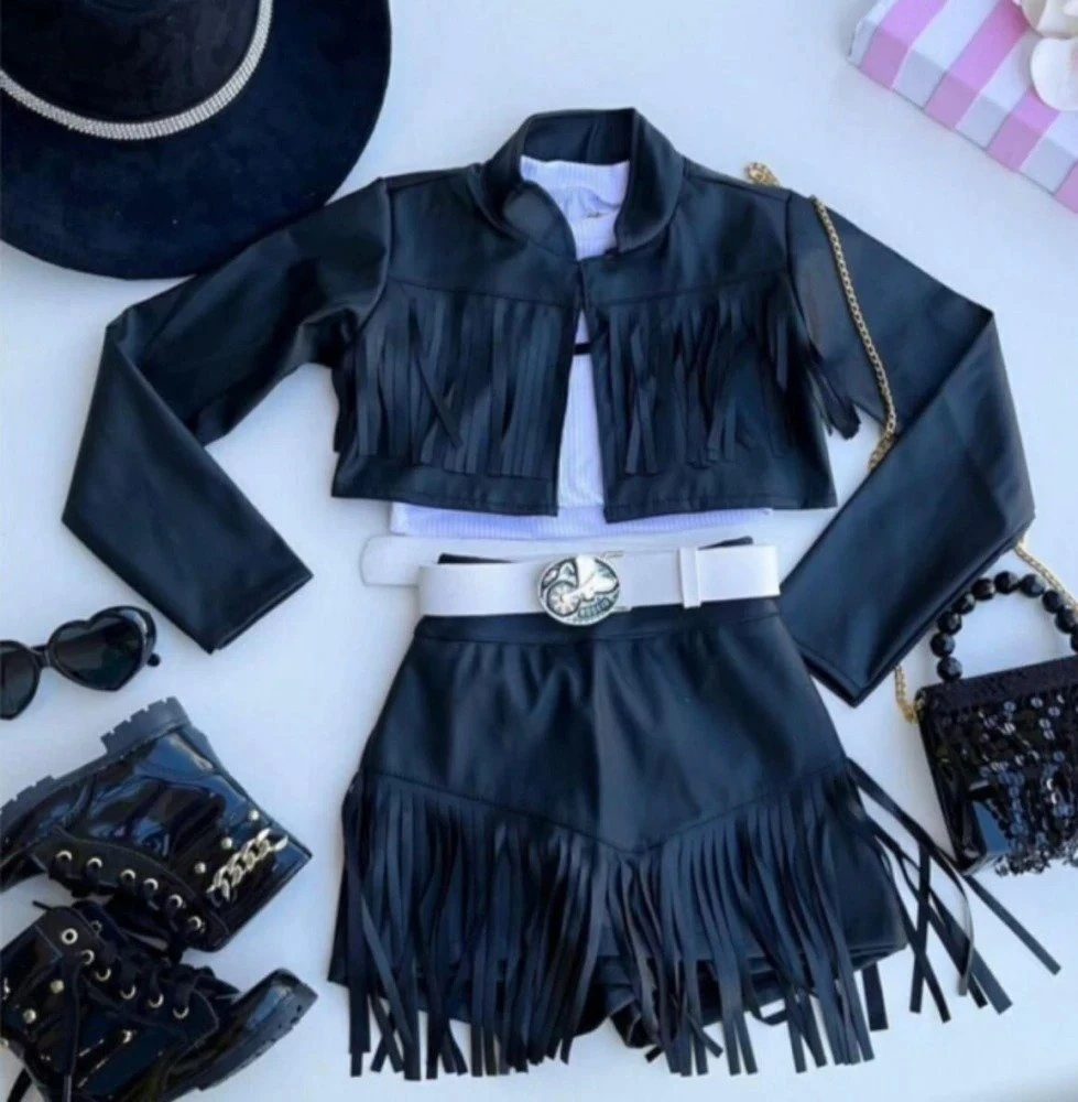 O Conjunto Boiadeira é perfeito para deixar as crianças ainda mais fofas e estilosas. Composto por uma jaqueta com franja, um shorts saia com franja e um cropped, o conjunto é ideal para os dias de passeio em festas de peão, festas juninas e até mesmo para festinhas temáticas nas escolas.