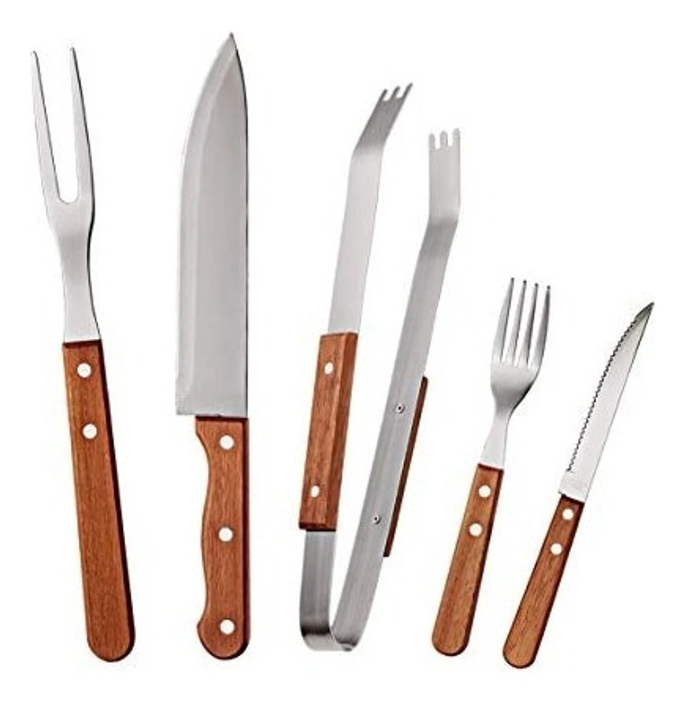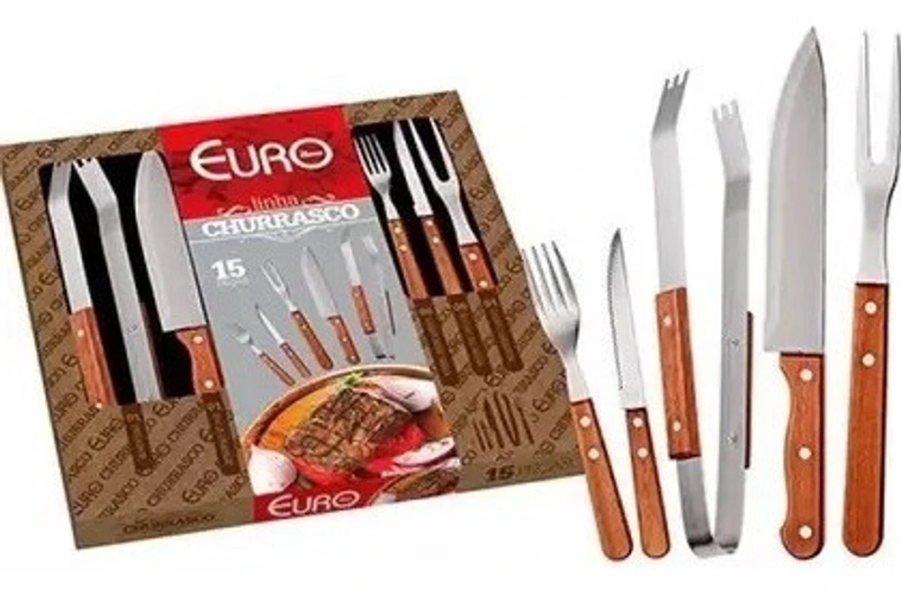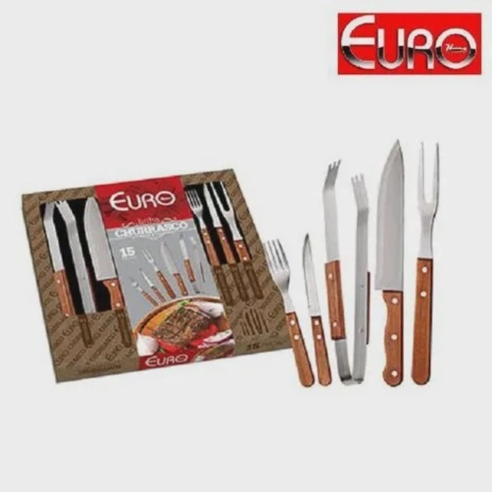 - Conjunto de utensílios Euro Home para churrasco com cabo de madeira 15 peças. Fabricado em inox e com cabo de madeira, este kit traz pinça, faca e garfo que facilitam o preparo de churrascos. As facas serradas e pontiagudas são ideais para cortar carnes.