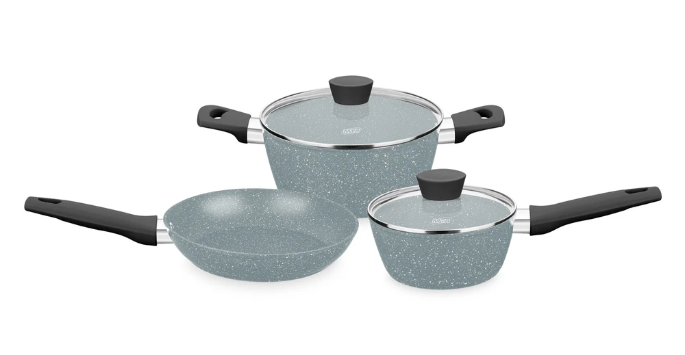 - Conjunto de 3 peças: frigideira, panela e caçarola com tampas de vidro temperado