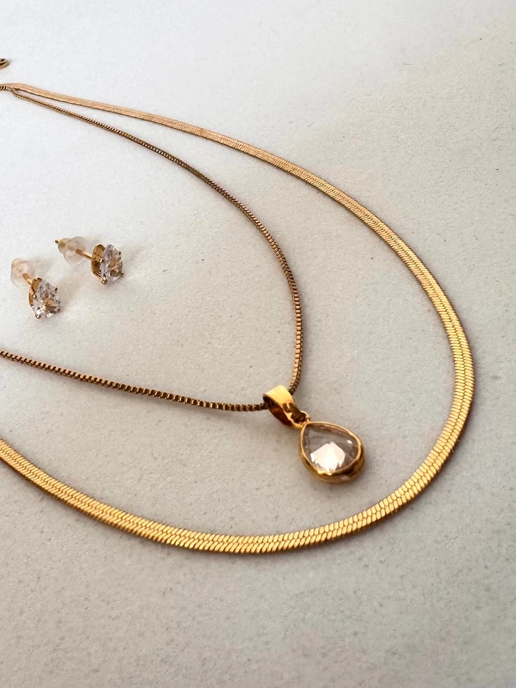 O colar possui um design exclusivo, com elos laminados que dão um toque de modernidade e sofisticação. Além disso, o ponto de luz em sua extremidade traz um brilho único e delicado, que irá destacar o seu rosto e trazer um charme especial para a sua produção.