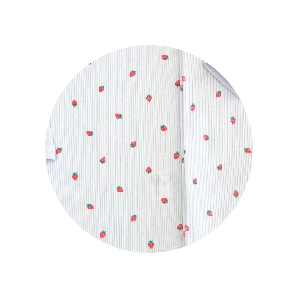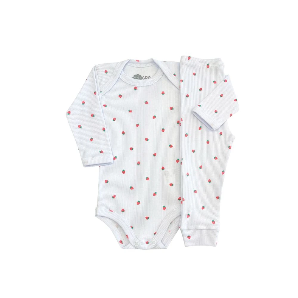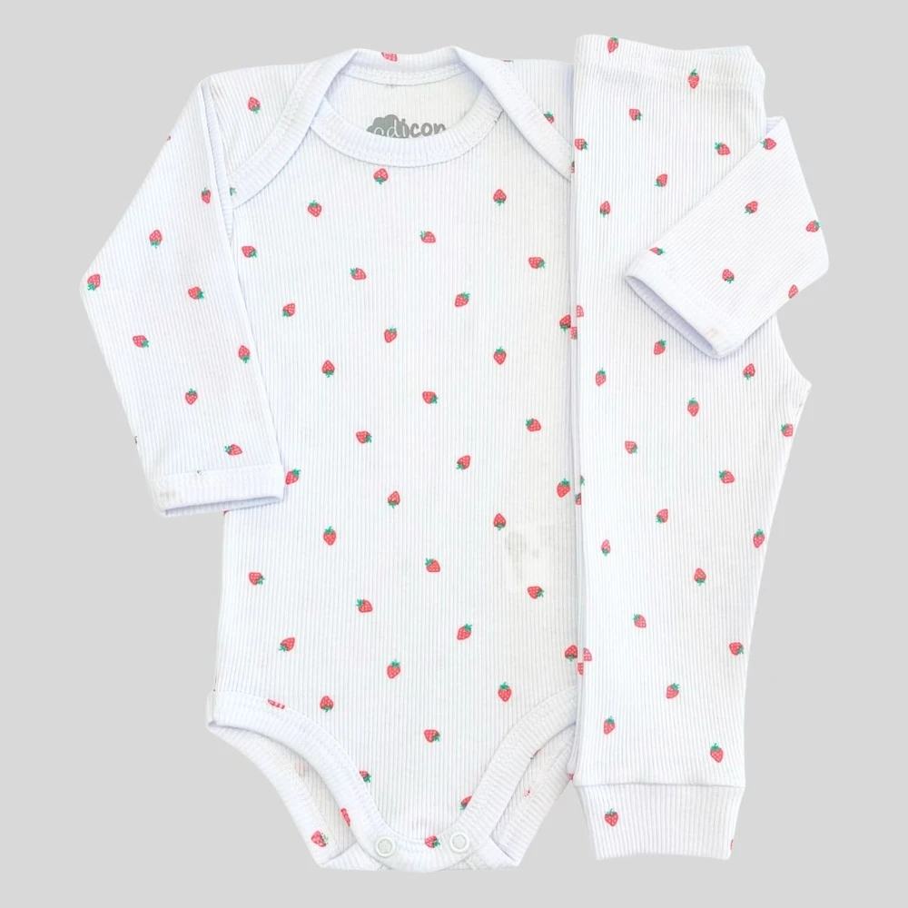 Conjunto de body manga longa para bebê em tecido canelado Branco estampa morango Vermelho