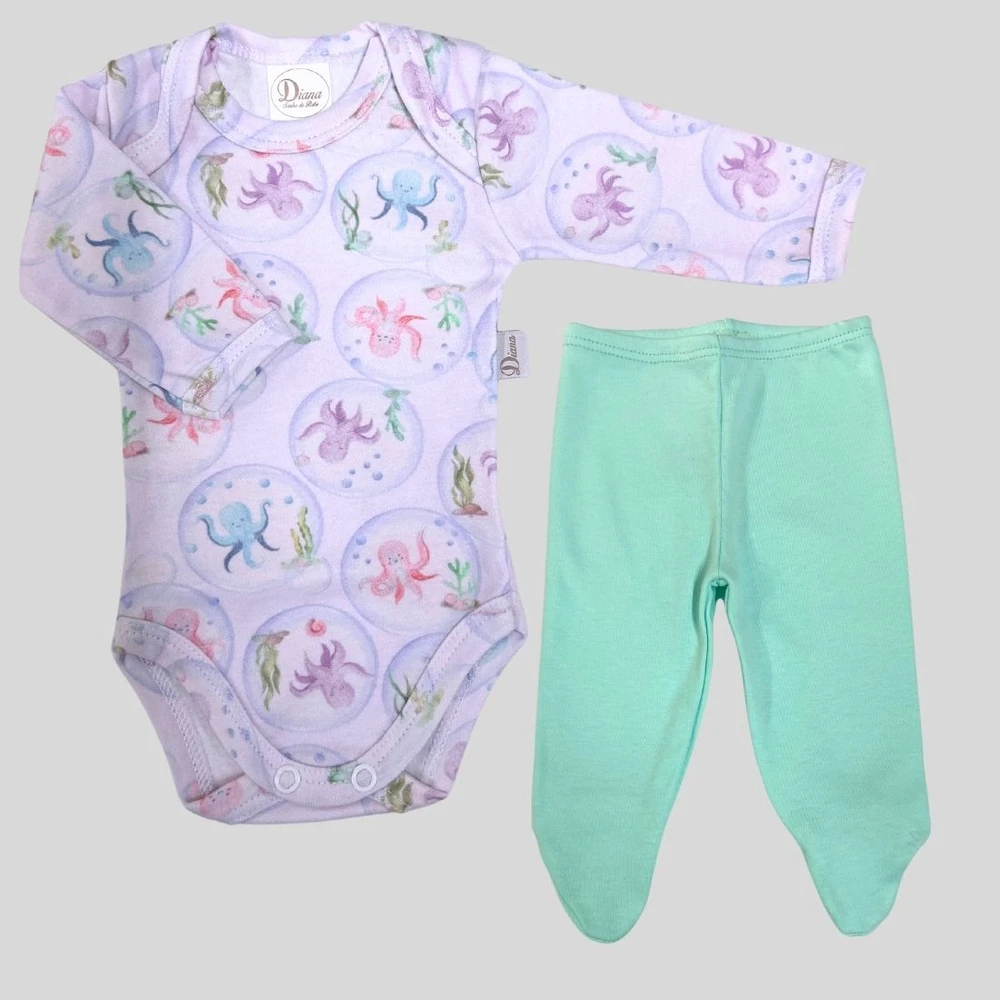 Conjunto de body manga longa para bebê prematuro em algodão egípcio estampa polvo Lavanda