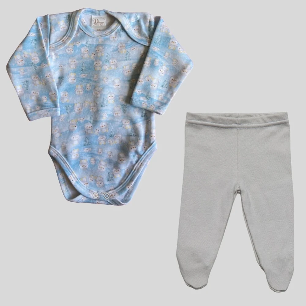 A calça mijão na cor cinza é em tecido liso suedine algodão egípcio combinando com o body estampado.